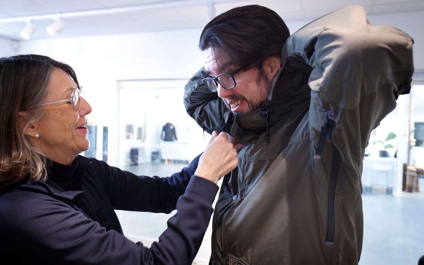 Vi börjar dock med ett annat labbrum – det för test med extremt regn. Jag drar på mig luvan över huvudet och kliver in. Allt blir en smattrande ljudkuliss av regnet som slår mot tyget och jag har svårt att höra Jonas instruktioner kring de uppgifter som finns att utföra i rummet.